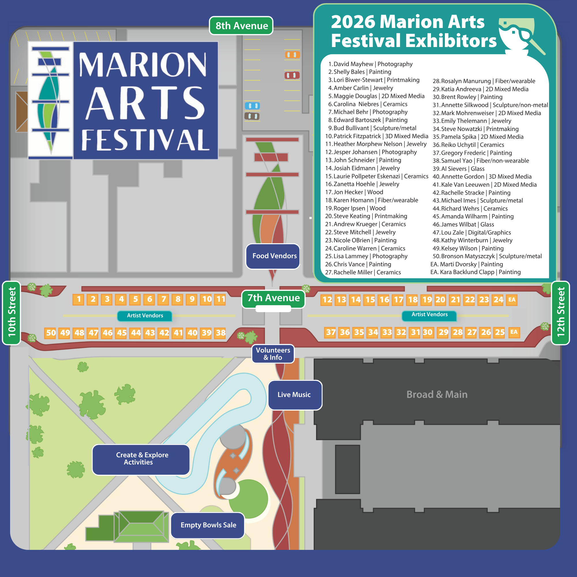 Located on 7th Avenue between 10th & 12th street, Marion’s Uptown festival-streetscape and the new plaza make for an accessible & exciting Marion Arts Festival.